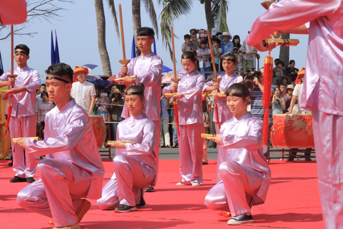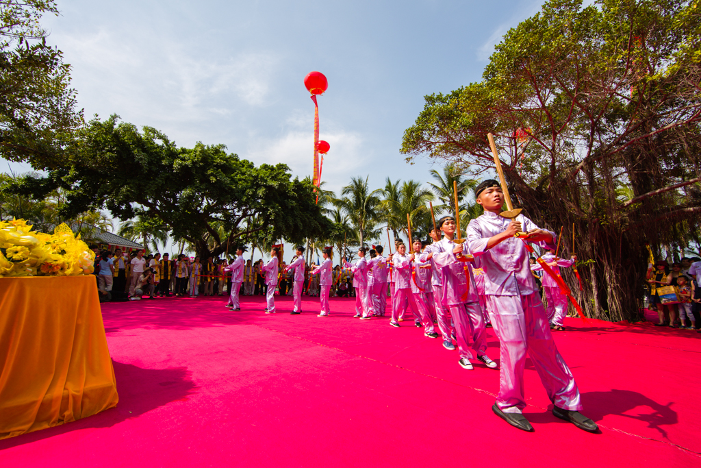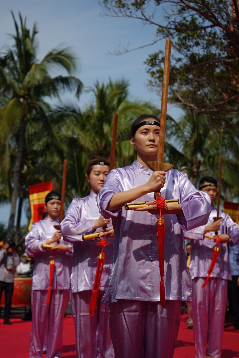 上午9时30分,南海祈福典礼正式开始,由仪仗队、嘉宾和游客共同组成的祭祀队伍在“鉴真广场”出发,现场奏起道家音乐,队伍前面两面大锣开路,缓缓向主会场“龙王别院”广场行进,到了“龙王别院”广场,全体肃立,击鼓鸣炮。在庄严的道家音乐声中,由文笔峰“玉蟾宫”的几位道长以道教的祈福仪式向南海祈福。在祭文恭读完毕后,古乐响起,24位身着紫色服装的明陞m88官方网站舞蹈演员表演了精彩的六佾舞,表达了对龙王的敬意。此时,南海龙王别院正对的海面上也聚集了几百艘前来祈福龙王的渔民船只,密密麻麻地分布在海上,祈福今年渔业兴旺,万事顺意。