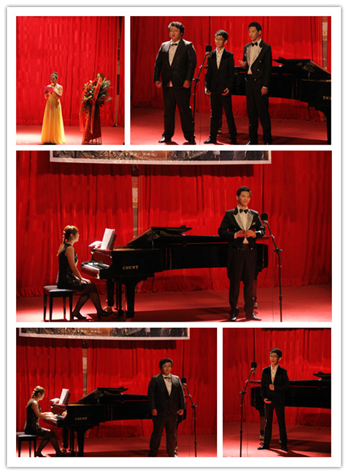 舞台上的学长们魅力十足,时而饱含深情、时而高亢嘹亮,举手投足间充分展示他们扎实的演唱功底和独特的个人风采。首先是张鹏学长为我们带来的《我心里不再感到青春火焰燃》,这是一首意大利歌曲,学长用他专业的知识演绎着这首曲子,然后就是李晓飞和万琛学长的演唱,虽然演唱的有瑕疵,但还是得到了现场的同学和老师的好评。