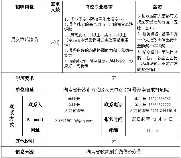 即日起,携带个人简历(联系电话)有效身份证,学历学位证书原件及复印件,一寸照片到湖南省歌舞剧院艺术楼4楼歌剧团办公室。(请提前电话联系)