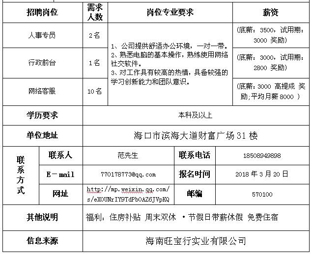 海南旺宝行实业有限公司,主要从事商务信息咨询,企业管理咨询服务,企业营销策划,企业形象策划,计算机软件开发,科技信息咨询服务等服务咨询行业。注册资金500万,目前公司分为4大部门,客服部、市场部、行政人事部、财务部。