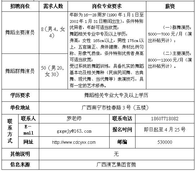 广西演艺集团有限责任公司(以下简称演艺集团)成立于2012年8月16日,由广西壮族自治区人民政府出资组建的国有独资企业。2016年7月,自治区人民政府将演艺集团整体并入广西文化产业集团有限公司。演艺集团下设广西歌舞剧院有限责任公司、广西杂技团有限责任公司、广西木偶剧团有限责任公司、广西演出有限责任公司、广西演艺文化创意有限责任公司、广西东兴国门演艺剧场有限责任公司六家子公司,共有演职人员500多名。