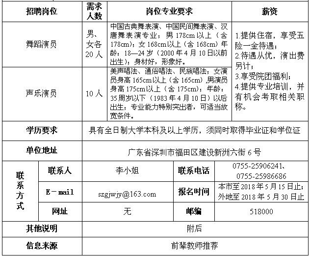 1.本公告所称毕业生均指纳入国家全日制普通高校统一招生计划并通过全日制普通高等教育毕业的毕业生,职工须为国外(教育部认可)正规院校毕业;2.应届毕业生需符合文化部、人社部有关毕业生接收要求,在校期间,业务水平突出或曾荣获过省部级以上专业比赛前三名的员工可优先考虑;3.除应届毕业生以外报名人员,具备一定相关工作经验或获奖经历者优先;4.户口不限。