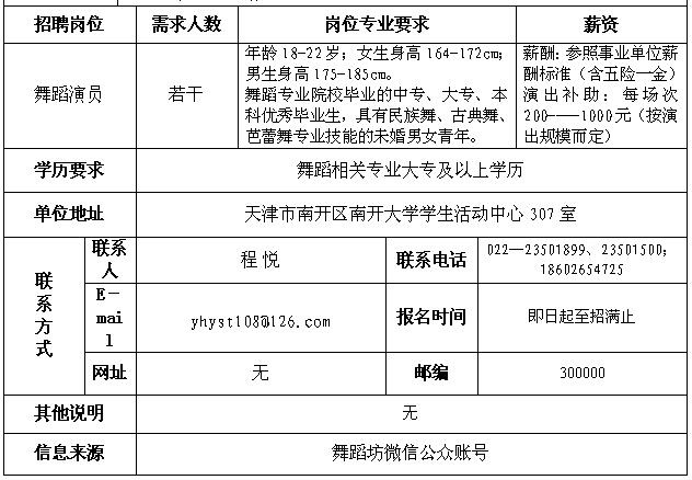 3、舞蹈专业院校毕业的中专、大专、本科优秀毕业生,具有民族舞、古典舞、芭蕾舞专业技能的未婚男女青年。