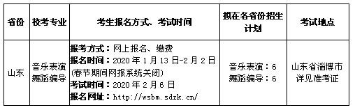 2020年公司艺术类音乐表演、舞蹈编导两个专业在以下省市组织专业单独测试(校考);其余未涉及到的全国各省、直辖市、自治区和专业均不组织专业单独测试(校考),承认生源地专业统考、联考专业成绩。