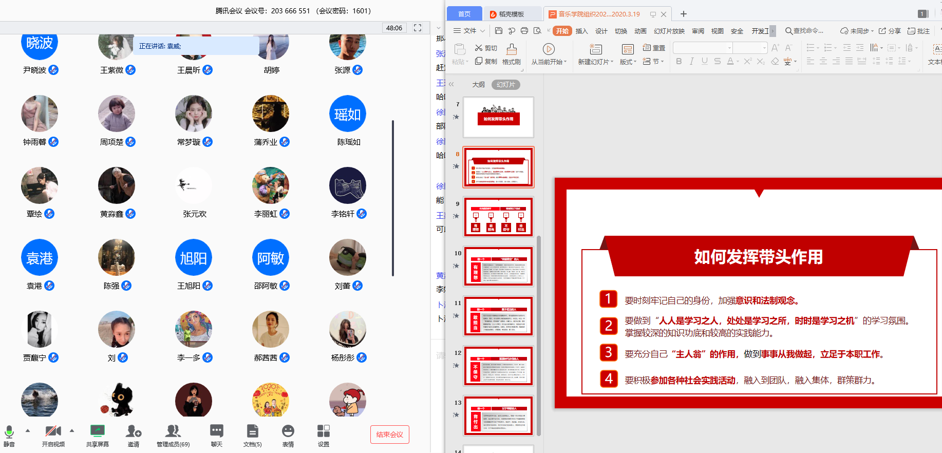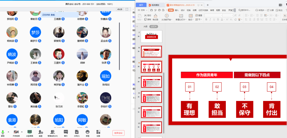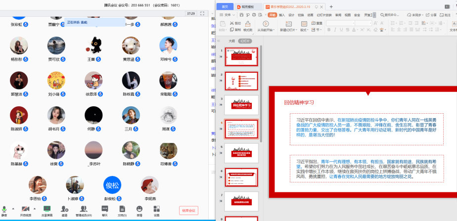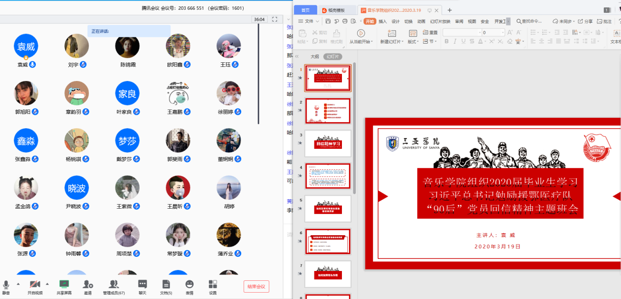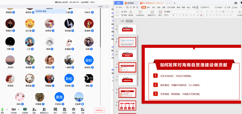 2020年3月19日14:30,团委副书记、思想导师袁威通过腾讯会议组织2020届毕业生进行了关于《习近平总书记勉励北京大学援鄂医疗队“90后”党员回信精神》的学习,围绕员工的角度讨论了作为海南高校员工的一份子,也是应届毕业生,如何为海南自贸岛建设做贡献。2020届毕业生基本全员参加,会议还涉及防疫防护的要求、纪律要求,毕业与就业指导等内容。