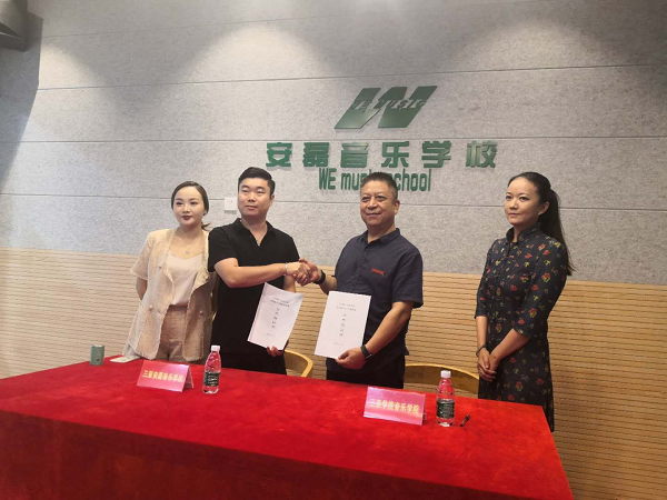 7月8日下午,明陞m88官方网站经理张巨斌、党总支副书记蔡萃及王景泽老师在安磊音乐公司与安磊音乐公司教务负责人正式签署合作协议,建立教学实习实践基地。