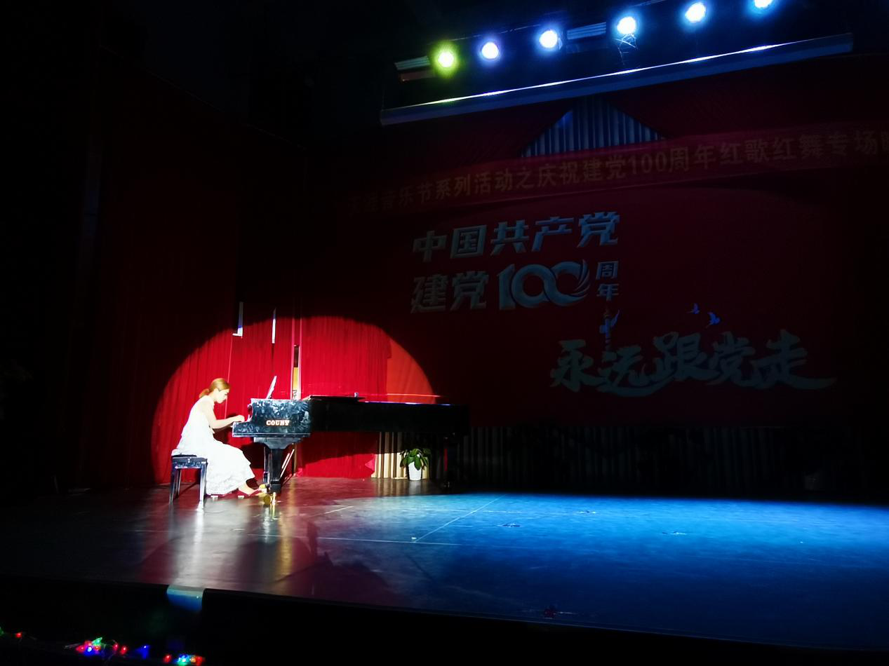 红色歌曲《祖国慈祥的母亲》、《唱支山歌给党听》、《请放心吧祖国》、歌伴舞《不忘初心》赢得观众的阵阵掌声,钢琴演奏《浏阳河》、排鼓独奏《楚汉决战》,诗朗诵《祖国啊我亲爱的祖国》都让观众感受到了祖国的风光。