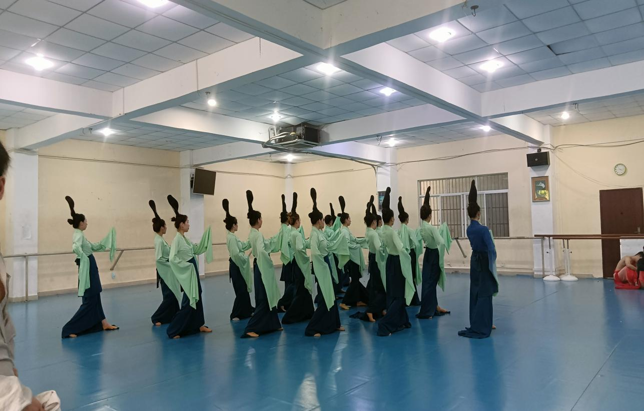 经过几个小时的排练,同学们早已汗流浃背,但舞姿依旧柔美中不失力量,轻盈中仍带铿锵。她们努力把自己最好的一面展现出来,坚持到最后的时刻。
