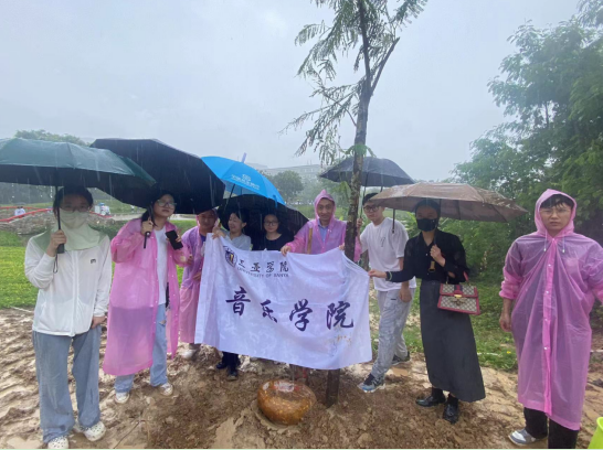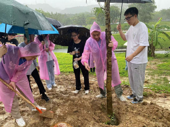 仪式现场伴随着淅淅沥沥的雨声,老师和同学们热情高涨,拿着铁锹、水桶等工具为树木培土浇水,同学们掘开厚重的泥土,种下感恩的树苗,浇灌青春的汗水,期盼夏日繁盛的绿,最后,师生们毕业林前合影留念。