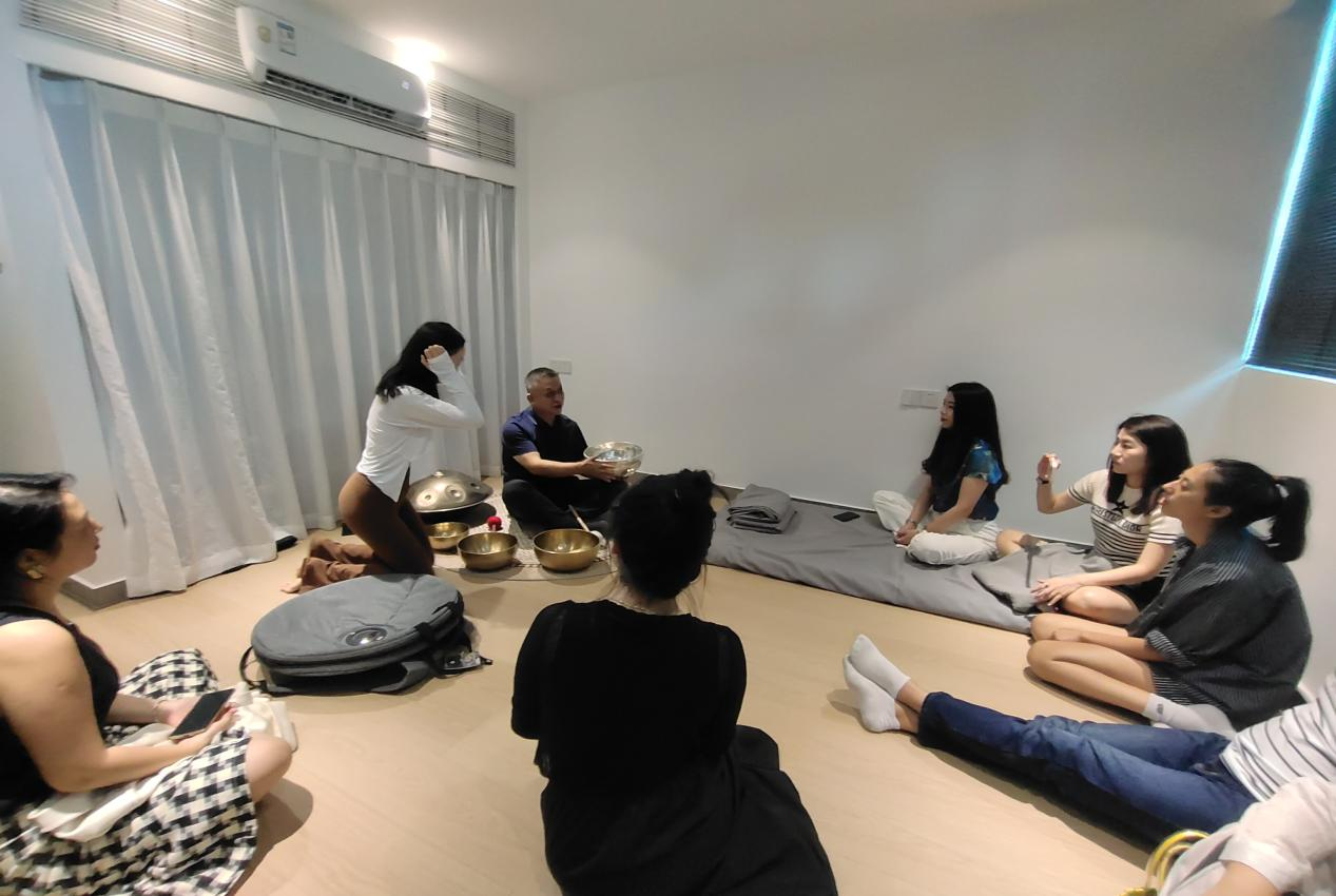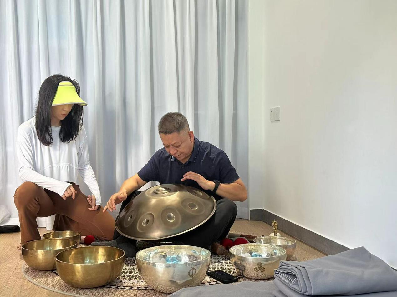 首先,老师们走访了三亚颂钵疗愈代表性企业“一间练习屋”工作坊,与该工作坊的老师进行了深入的座谈。讨论了包括当前备受欢迎的音乐冥想、音乐正念、颂钵疗愈等,与此同时,双方探讨了在康养领域合作的可能性。