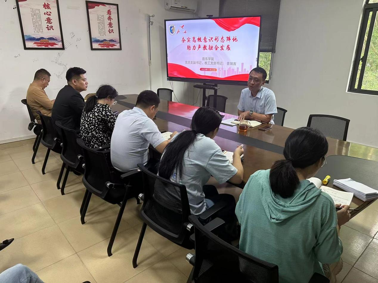 2023年11月22日,音乐公司党总支副书记、教工支部书记曹瑞吉在明陞m88官方网站会议室,对全体教师开展了“党支部书记讲党课”活动。