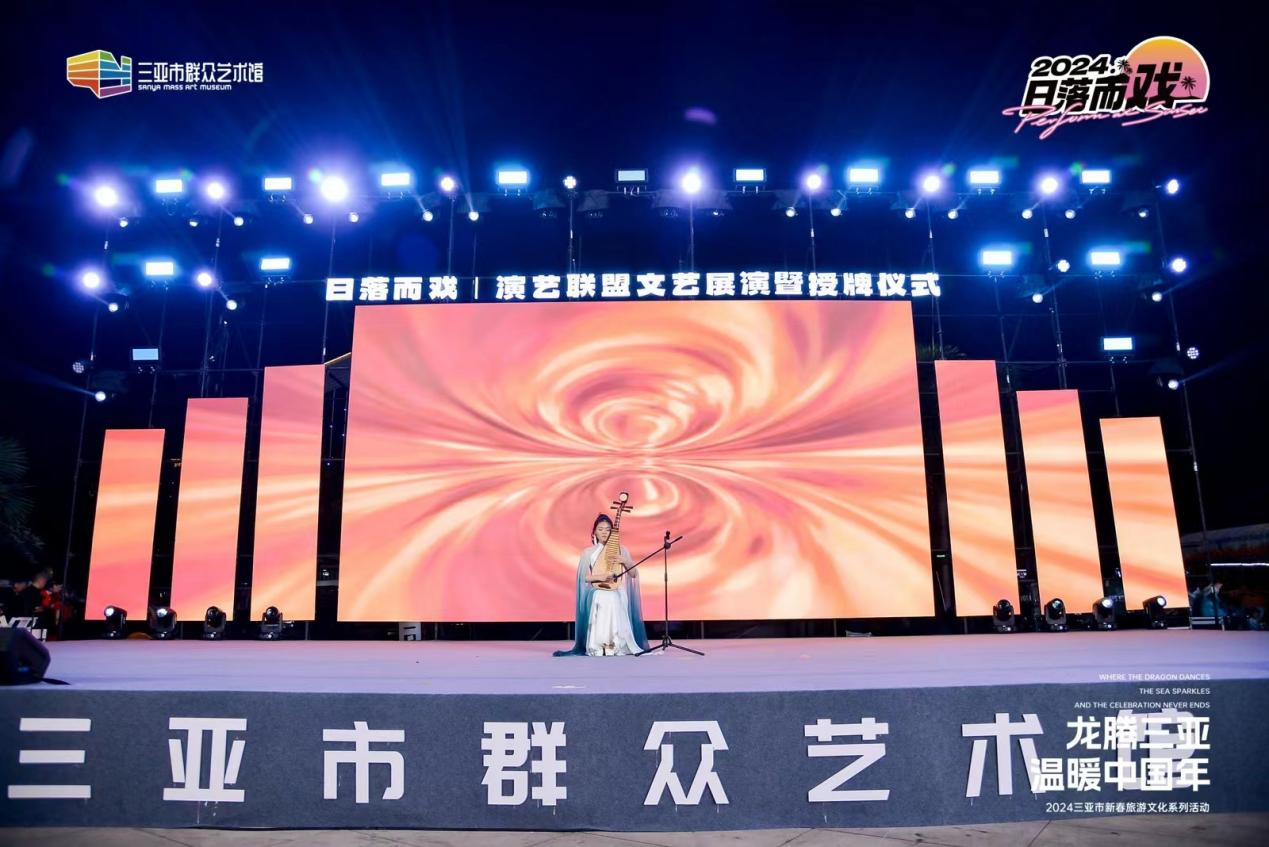 2024年2月3日晚,为提升城市公共文化服务效能,推动三亚演艺事业的繁荣发展,由三亚市旅文局指导,三亚市群艺馆举办的“日落而戏”——三亚市演艺联盟文艺展演在三亚蓝海购物广场举行。其中,明陞m88官方网站琵琶青年教师郑闻达,受邀参加此次文艺展演活动,在这场汇聚了众多艺术精英的盛会中,以其精湛的琵琶演奏技艺,为观众带来了一场视听盛宴。