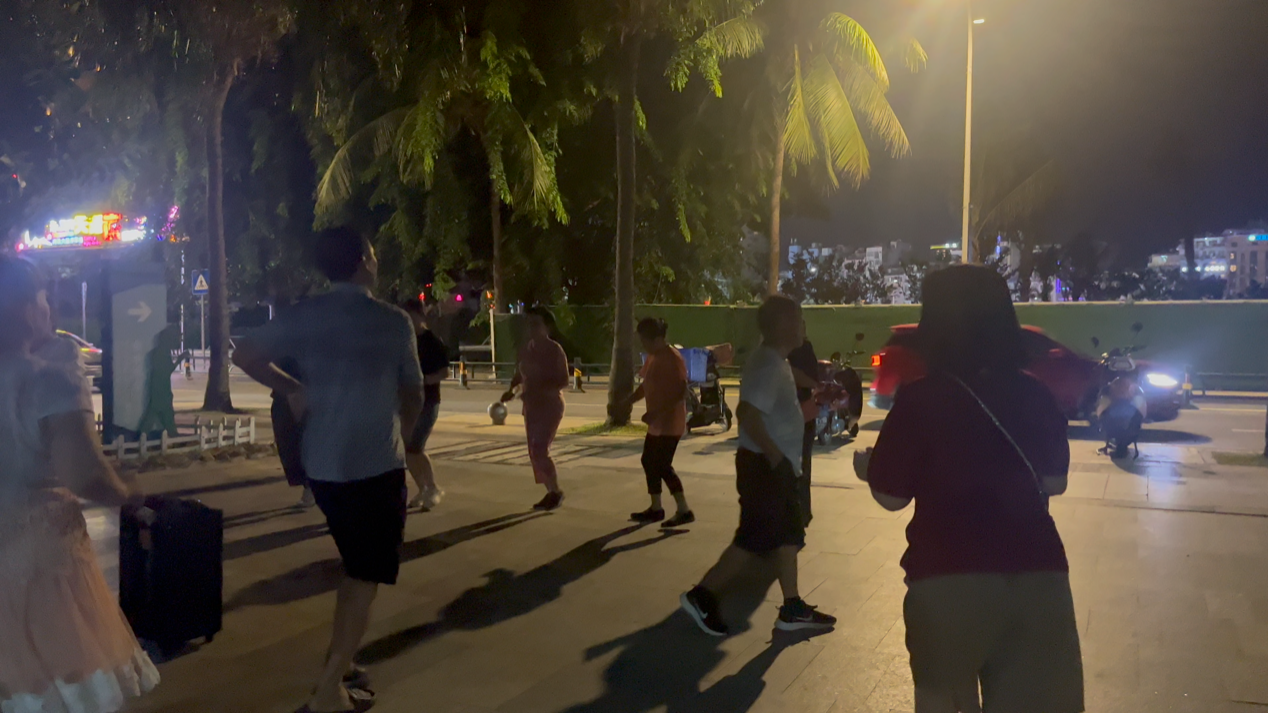 从儋州回到三亚,恰巧又在海月广场再次听到儋州调声。在这条热闹的海边广场沿岸,每隔一段路,傍晚开始就有很多人伴着儋州调声一边唱一边跳。不仅仅是老年人,其中很多北方人以及年轻人也同我一样被淳朴动听的儋州调声感染,不约而同地感受它的魅力。