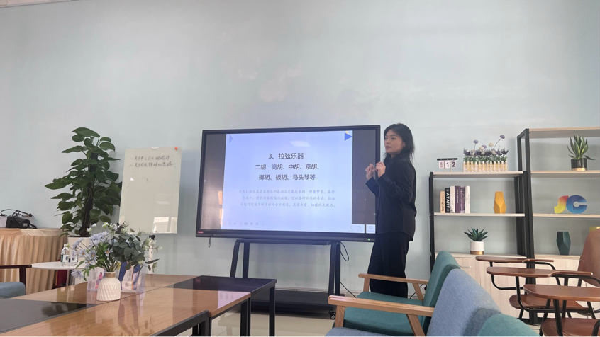 活动中首先分享了弦乐中的弹拨乐器:古筝、古琴、琵琶、三弦、中阮等。之后又一一介绍了我国的拉弦乐器:二胡、高胡、中胡、马头琴、板胡、京胡等。在介绍之余,还穿插着乐器的演奏音频,在接收知识的同时,更能直观的感受到中国传统音乐的历史文化及独特魅力。郑老师在活动中分享到,现如今这些传统乐器也经历了不断创新与发展,使得音色更加丰富、表现力更加强大,并且也开始与现代音乐元素相结合,相信在未来国乐的发展会越来越好。