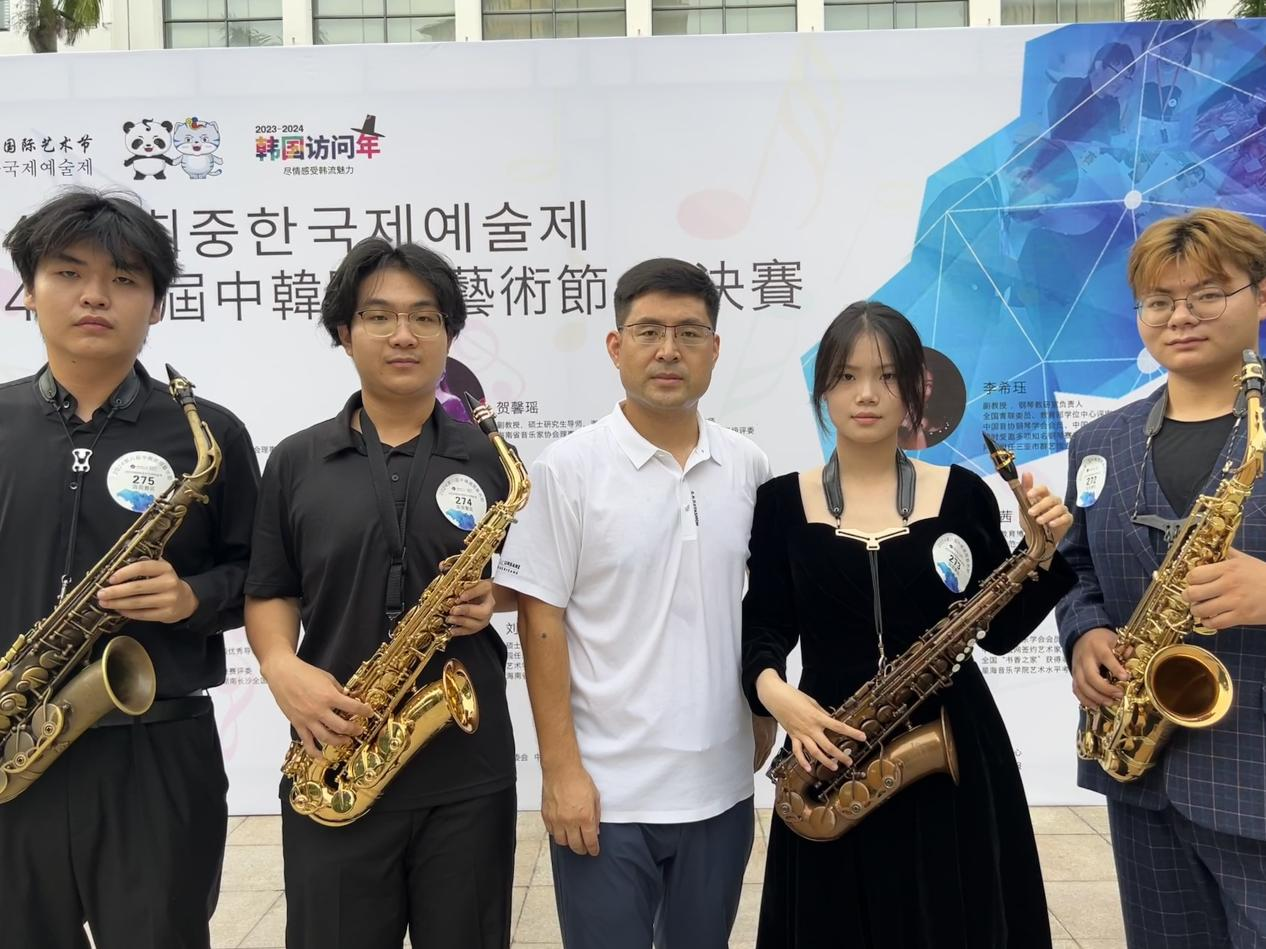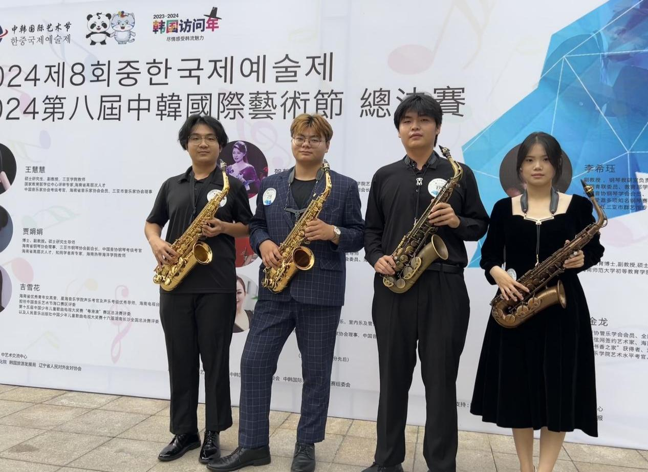 2024“中韩国际艺术节”三亚赛区于6月15日在海南省法官进修公司拉开帷幕。公司管乐老师马金龙指导的音乐表演专业23级的四位萨克斯学员:贾焘安、杨国志、田伟博、王家倪参加的此次比赛。并在300多位参赛选手中,脱颖而出。分别荣获1个一等奖,3个二等奖的好成绩。