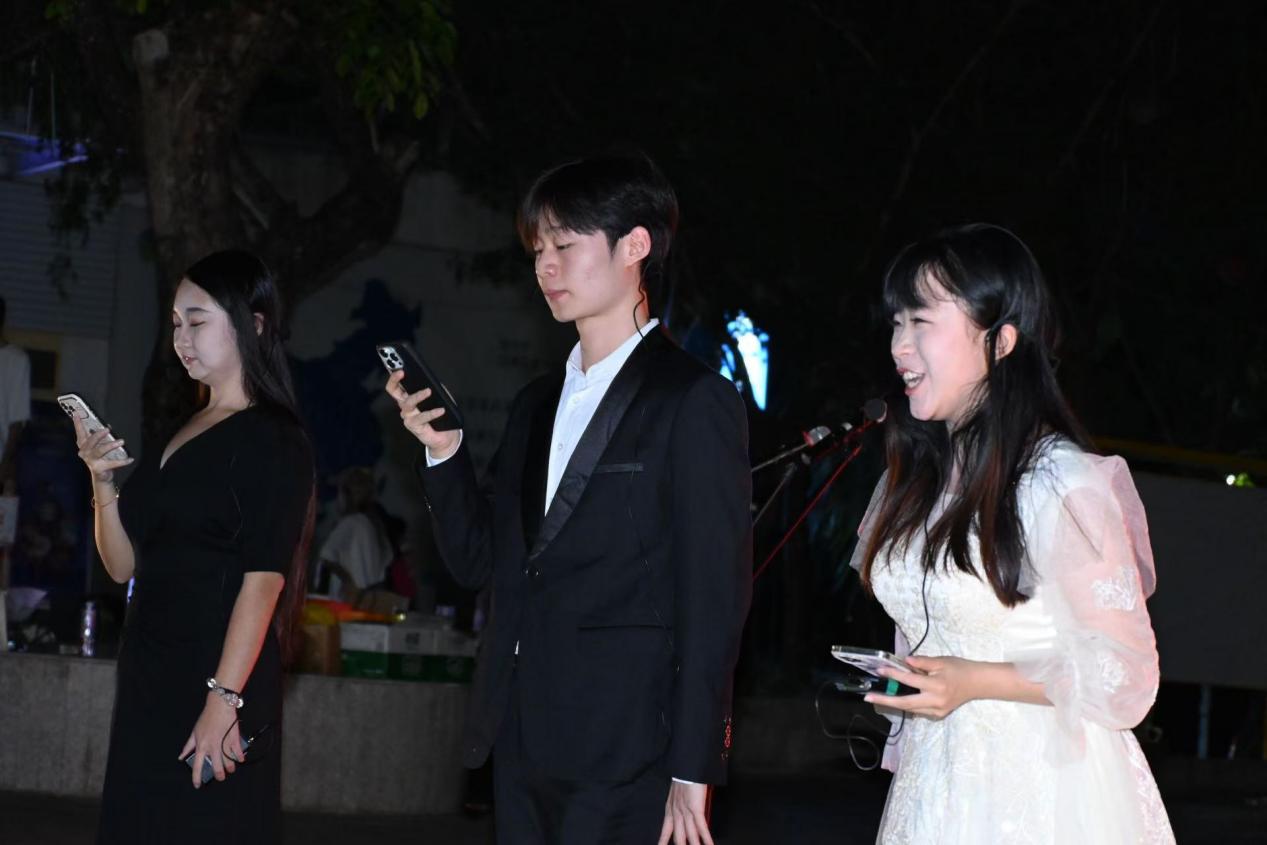 互动环节欢乐四溢,“圣诞老人”伴随《铃儿小叮当》惊喜现身,新年礼物与即兴主持点燃全场热情,台上台下笑声不断,拉近艺术与生活距离。此后,24 级刘晨、23 级徐可等同学接连献唱,美声、流行各展风姿,歌剧片段更是惊艳四座,23 级王雅婷、徐可《等着我亲爱的人》,陈诺《再看一眼亲人》,用精湛唱功重现经典,彰显深厚教学功底打磨下的专业素养。