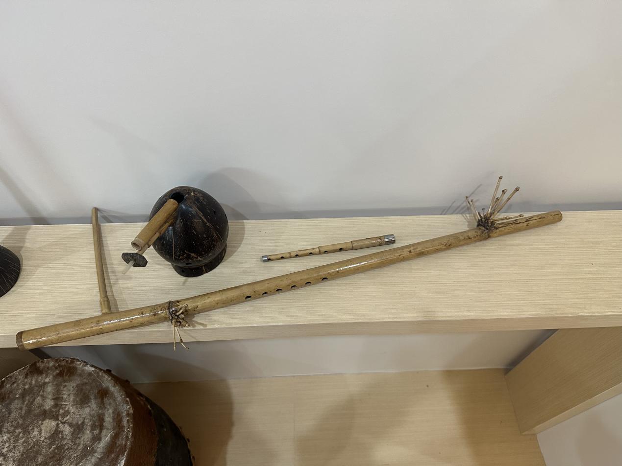 白沙黎族文化馆内的有一处的文化窗口,集中呈现了黎族传统音乐与乐器的独特魅力,展示的乐器包括鼻箫(虽劳)、哩咧(双管竹笛)、卓巴(木鼓)、树叶吹奏、叮咚(竹制打击乐器)、木鱼、小鼓等。
