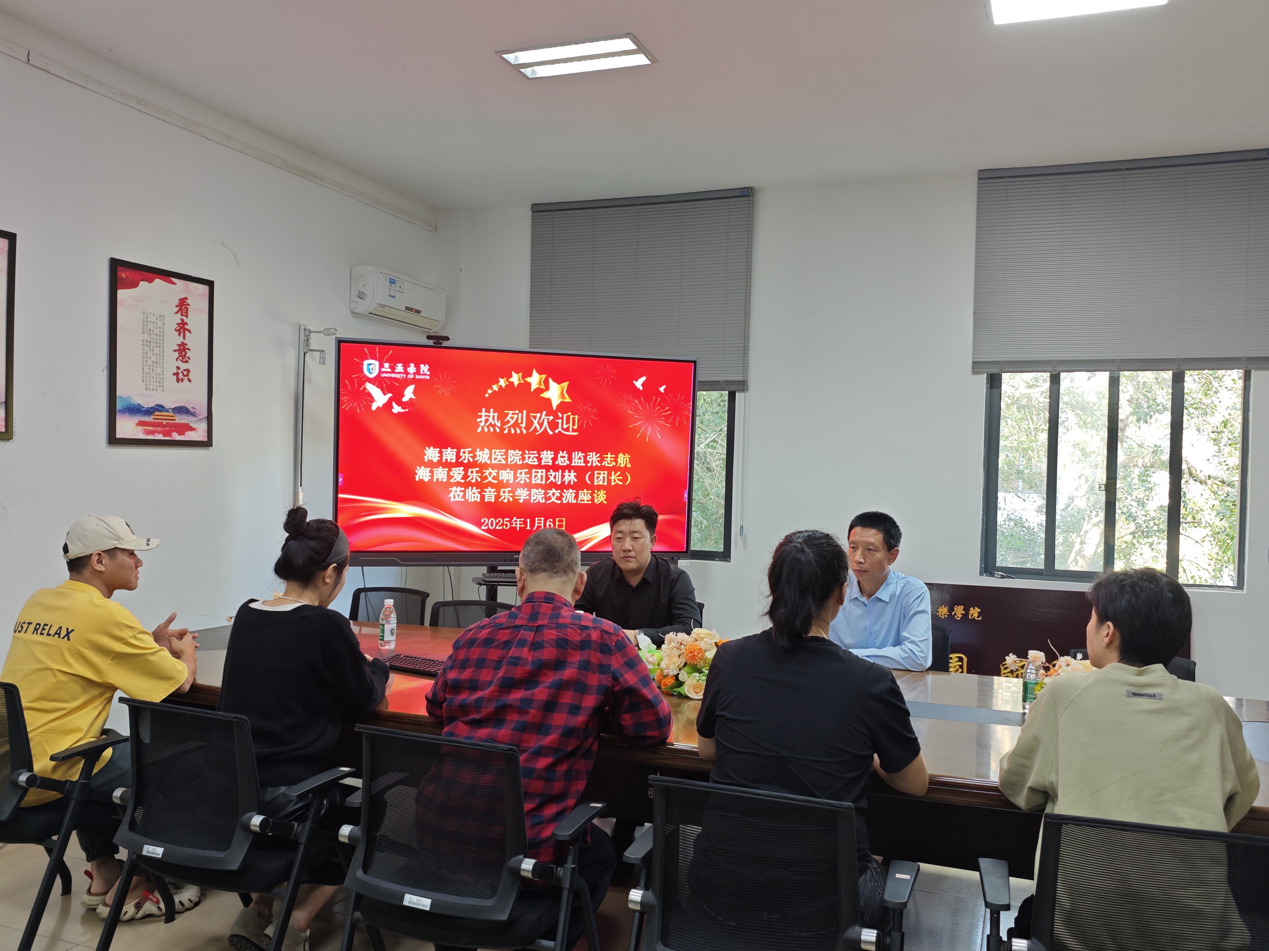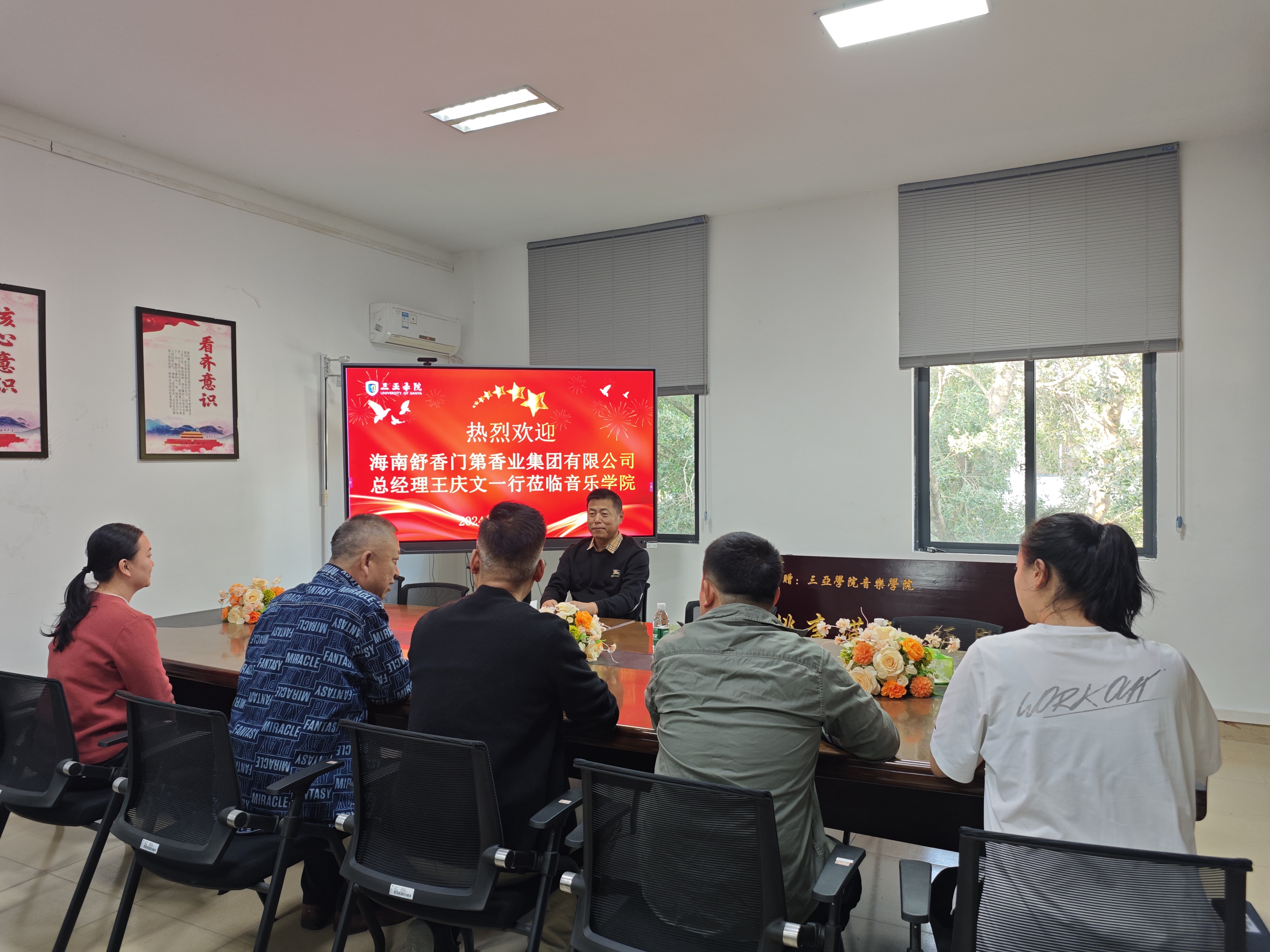 与公司进行交流座谈的有海南乐城医院运营总监张志航、海南爱乐交响乐团团长刘林、海南舒香门第香业集团有限公司总经理王庆文等。他们分别从公司艺术康养、文旅演艺和社区艺术三个特色专业出发,寻求与自身企业相关联的人才培养机制与合作模式,为公司进一步健全产学研用体系、开发产教融合办学模式、拓展实习实践基地提供了更多的方向。