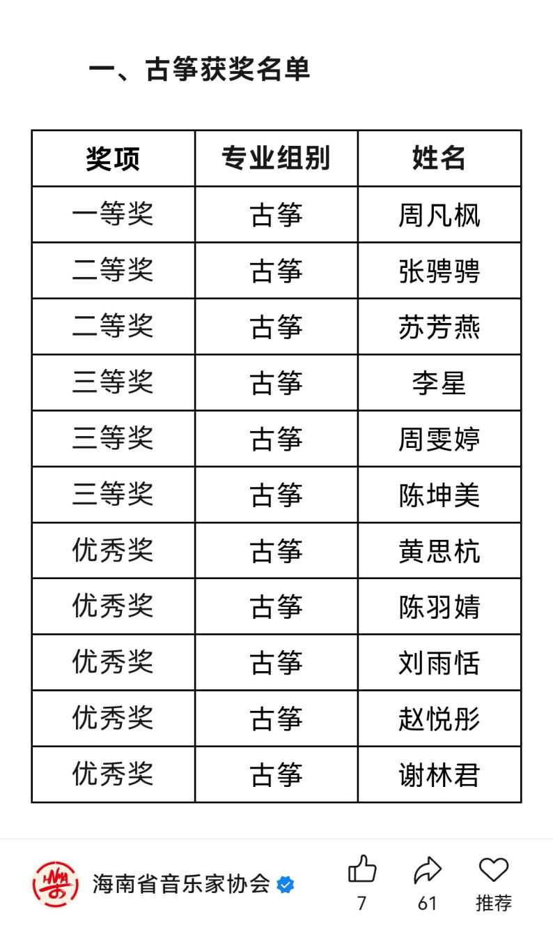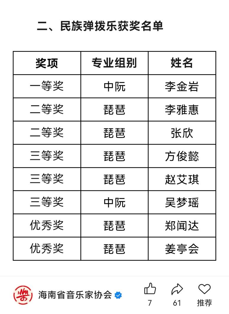 本届金钟奖海南赛区的古筝和民族弹拨乐(琵琶、中阮、柳琴、三弦)选拔赛均为视频评选,两位老师在完成日常工作与教学的同时,精心准备比赛视频的录制并荣获佳绩。比赛中,两位青年教师以扎实的专业功底、独特的艺术表现力和稳定的舞台发挥,赢得了评委的高度认可。