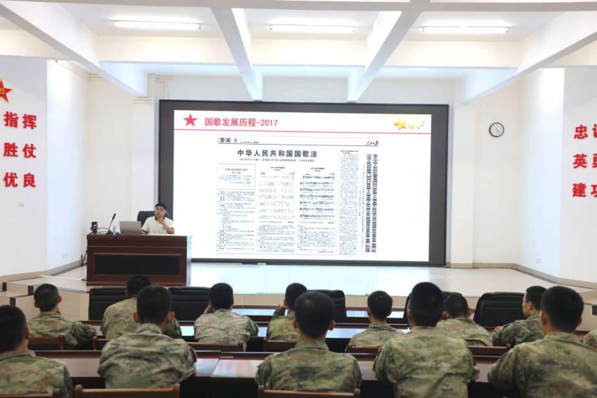 “国歌是国家的灵魂之声,承载着民族的血性与尊严。”马金龙通过对比俄罗斯、美国等国公民对国歌的敬畏态度,强调了国歌的神圣性与教育意义。讲座尾声,全体官兵在马金龙的指挥下高唱国歌,嘹亮的歌声响彻军营,将现场氛围推向高潮。